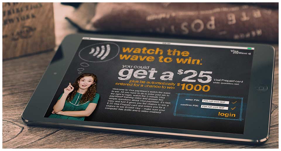 To help build employee awareness and expertise for Visa payWave at HMV locations, we were asked by the client to come up with a staff incentive that would both engage and educate. The result was an online quiz with an easy to follow educational video. Employees that scored the best amongst HMV locations were entered into a draw for a Visa gift card prize.